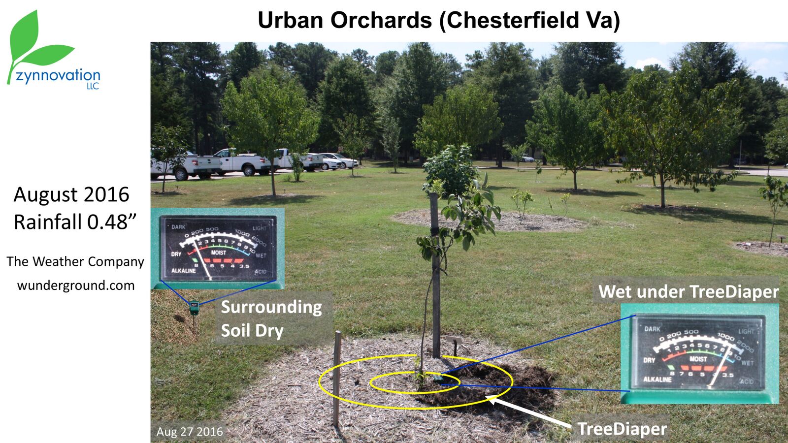 This urban orchard project was started in June 2013 partnering with Chesterfield County Virginia. Two groups of ten fruit trees were planted on a field without irrigation. One group trees were installed with TreeDiaper® system and the other group trees were installed with watering bags. Watering (with water trucks) schedules and natural rainfall were recorded during the testing period.